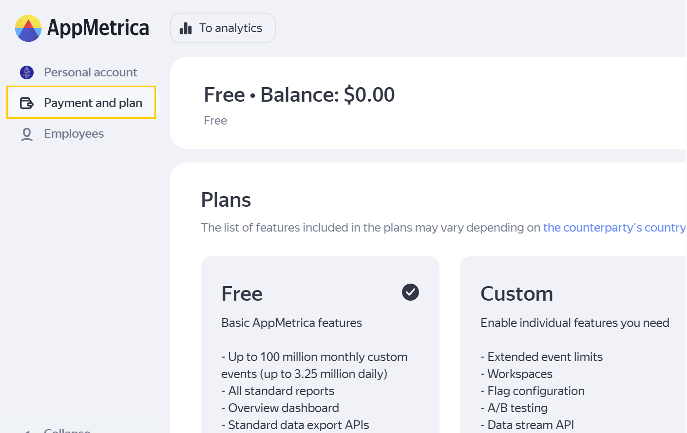 When registering an AppMetrica account, you automatically get the Free plan. If you want to use paid tools, switch to the Custom or Pro plan.