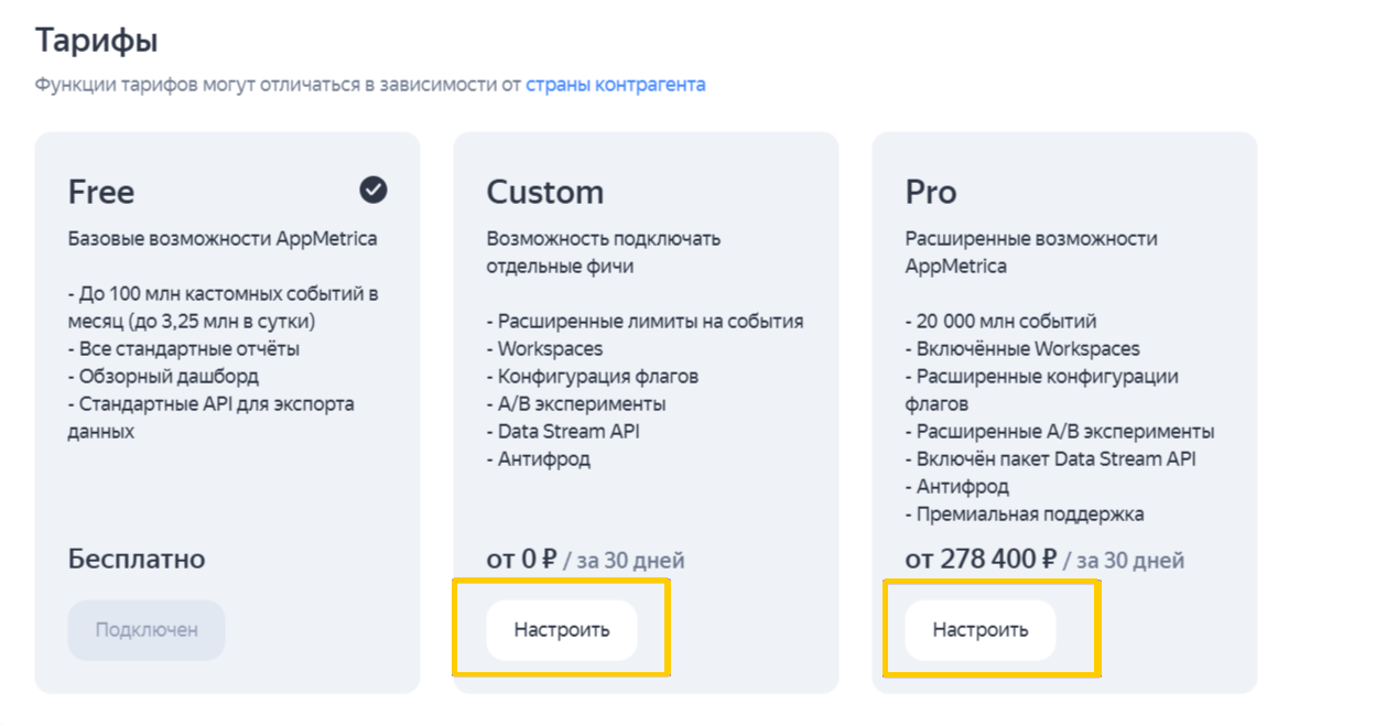 При регистрации кабинета AppMetrica автоматически подключается тариф Free. Если вы хотите использовать платные инструменты, подключите тариф Custom или Pro.