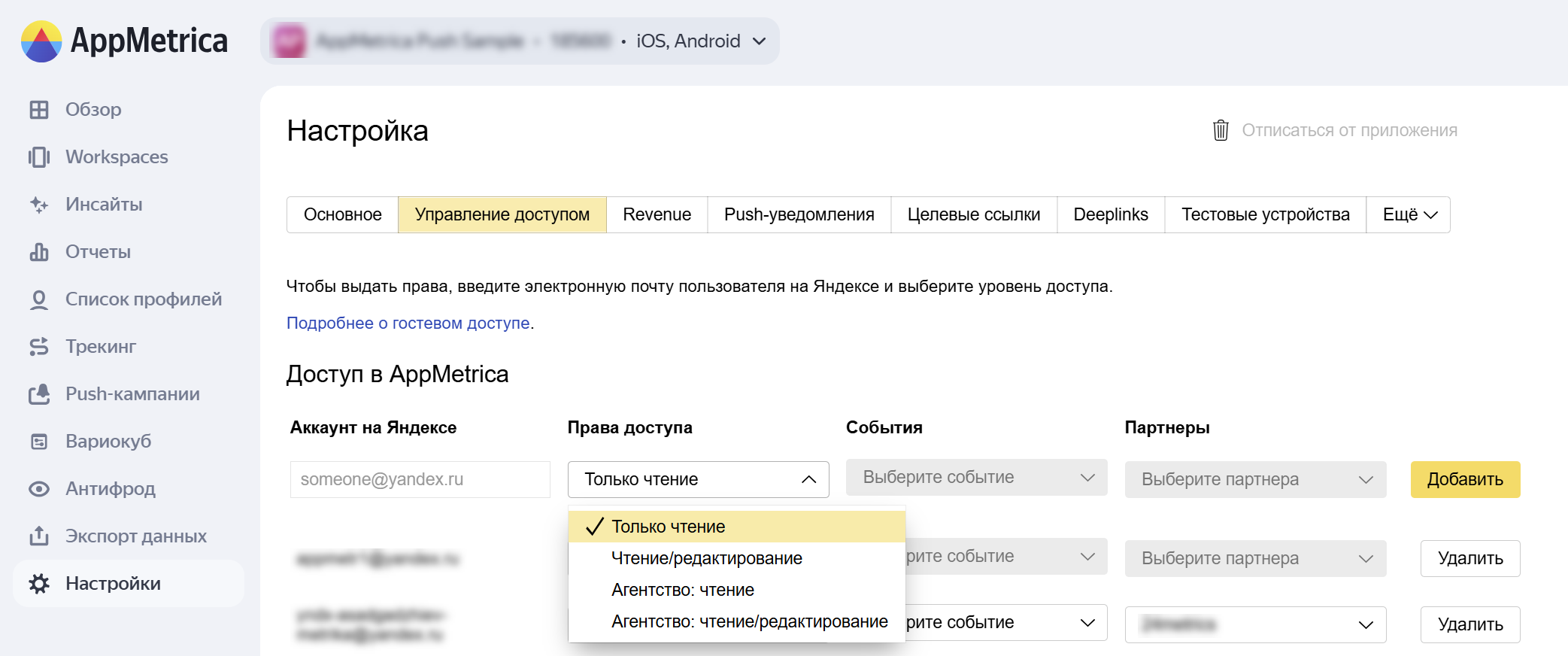 Агентство: чтение/редактирование — пользователь сможет менять настройки приложения, настраивать и создавать трекеры, а также просматривать статистику по выбранным источникам трафика и целевым событиям.